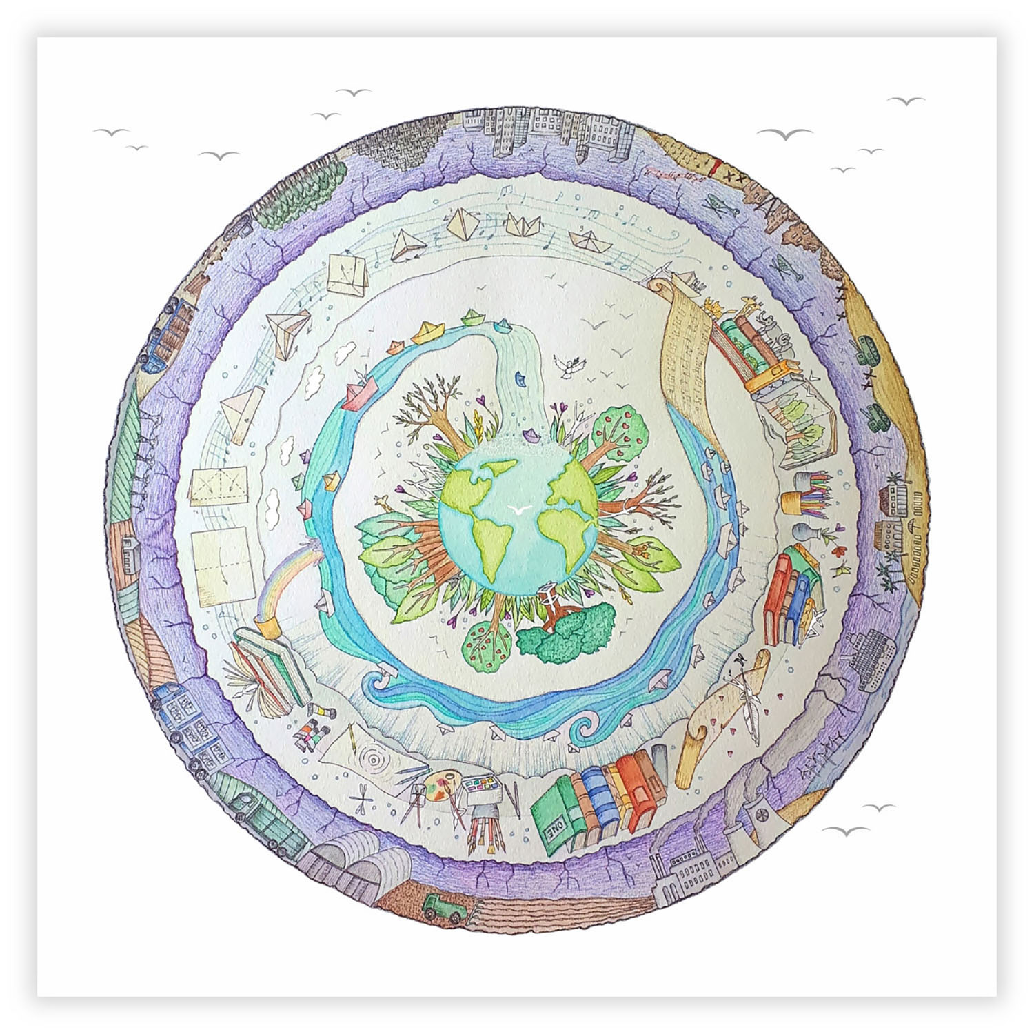 Cette peinture aquarelle est la réponse inspirée à la demande d’un couple de collectionneurs d’Arches de Noé. Ils m’ont ouvert l’espace des possibles et offert la confiance. De visions en révélations, ONE est arrivée, accompagnée de son chant. L’intention au travers du thème est la Rédemption.