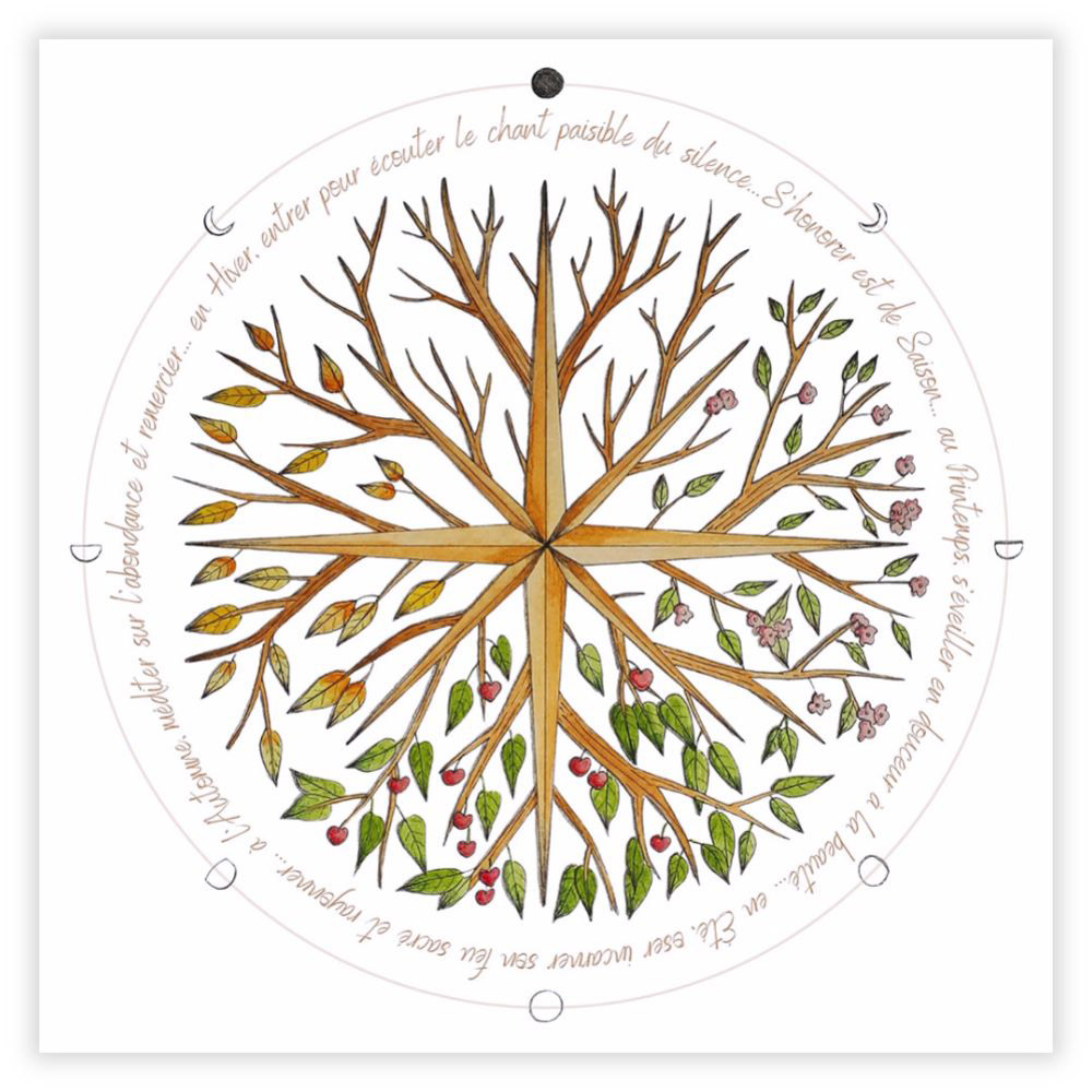 Phrase écrite sur l'illustration : "S'honorer est de Saison... au Printemps s'éveiller en douceur à la beauté... en Été, oser incarner son feu sacré et rayonner... à l'Automne, méditer sur l'abondance et remercier... en Hiver, entrer pour écouter le Chant paisible du silence..."